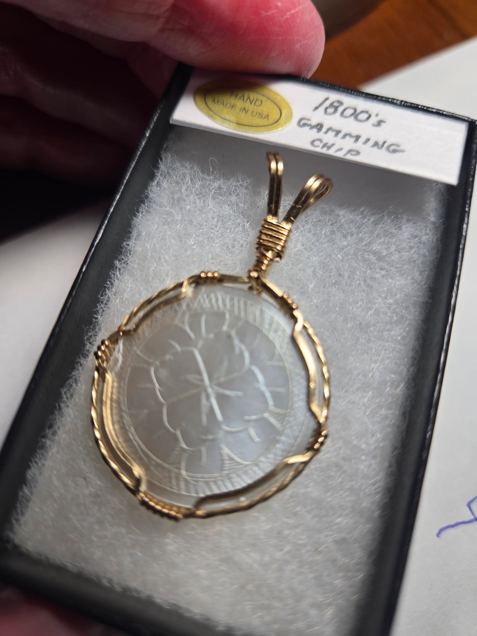 Custom Wire Wrapped 1800's Chinese antique carved Gaming Chip 14Kgf Necklace/Pendant