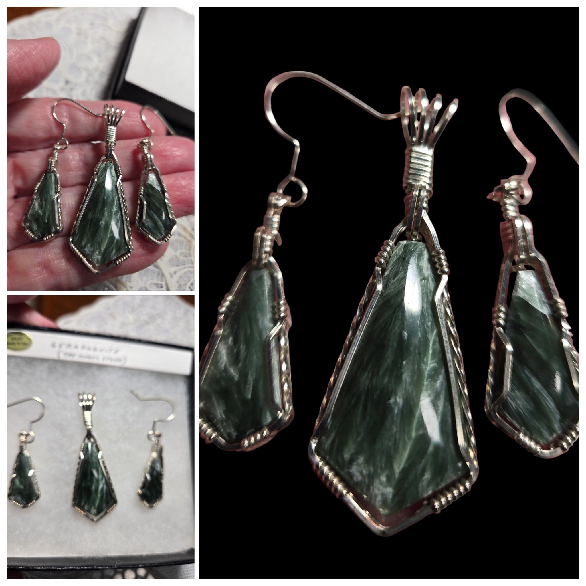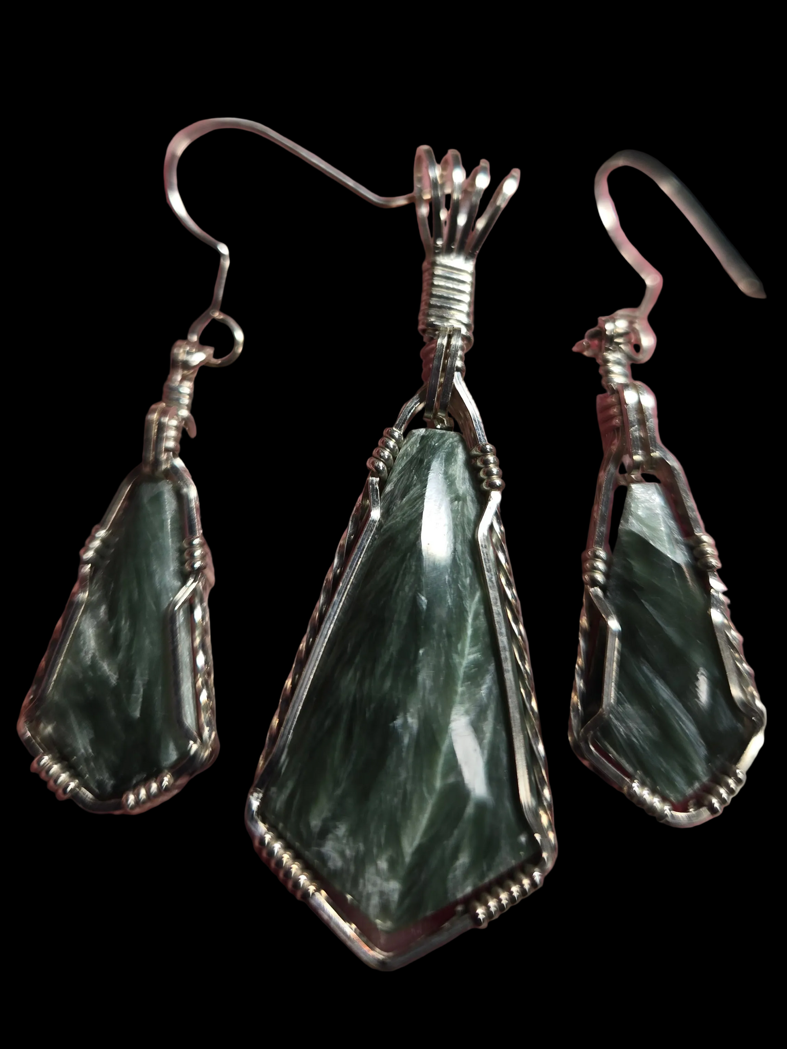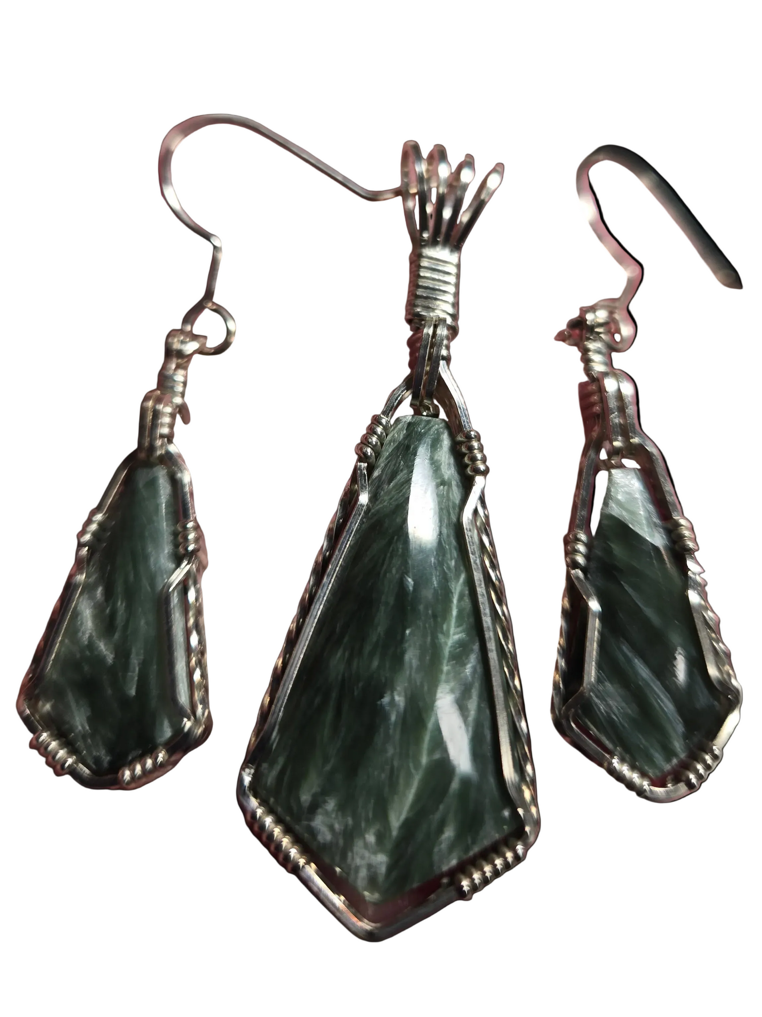 Custom Cut Polished & Wire Wrapped Seraphenite (Angel Stone) Set Necklace/Pendant & Earrings in Sterling Silver .935