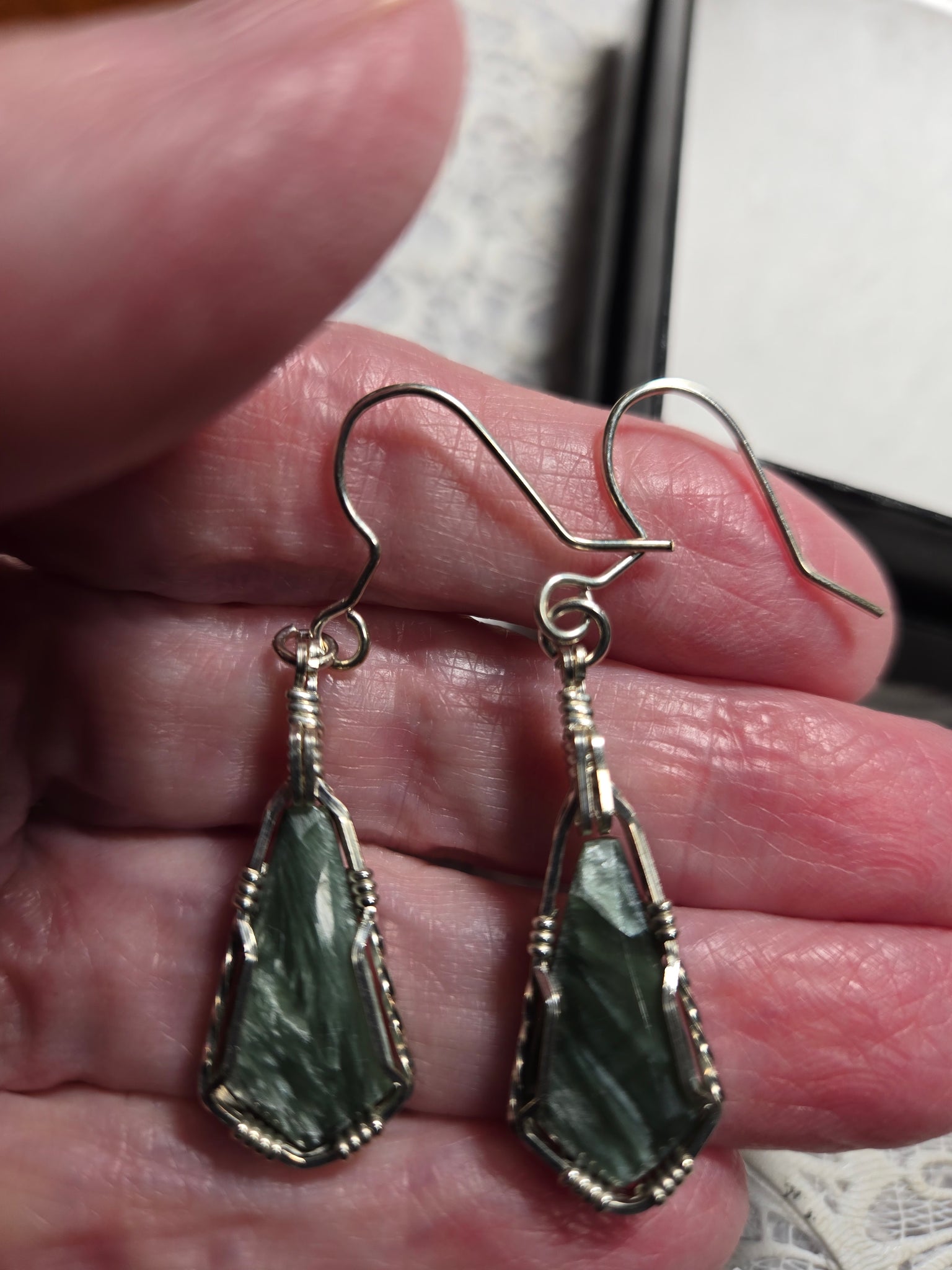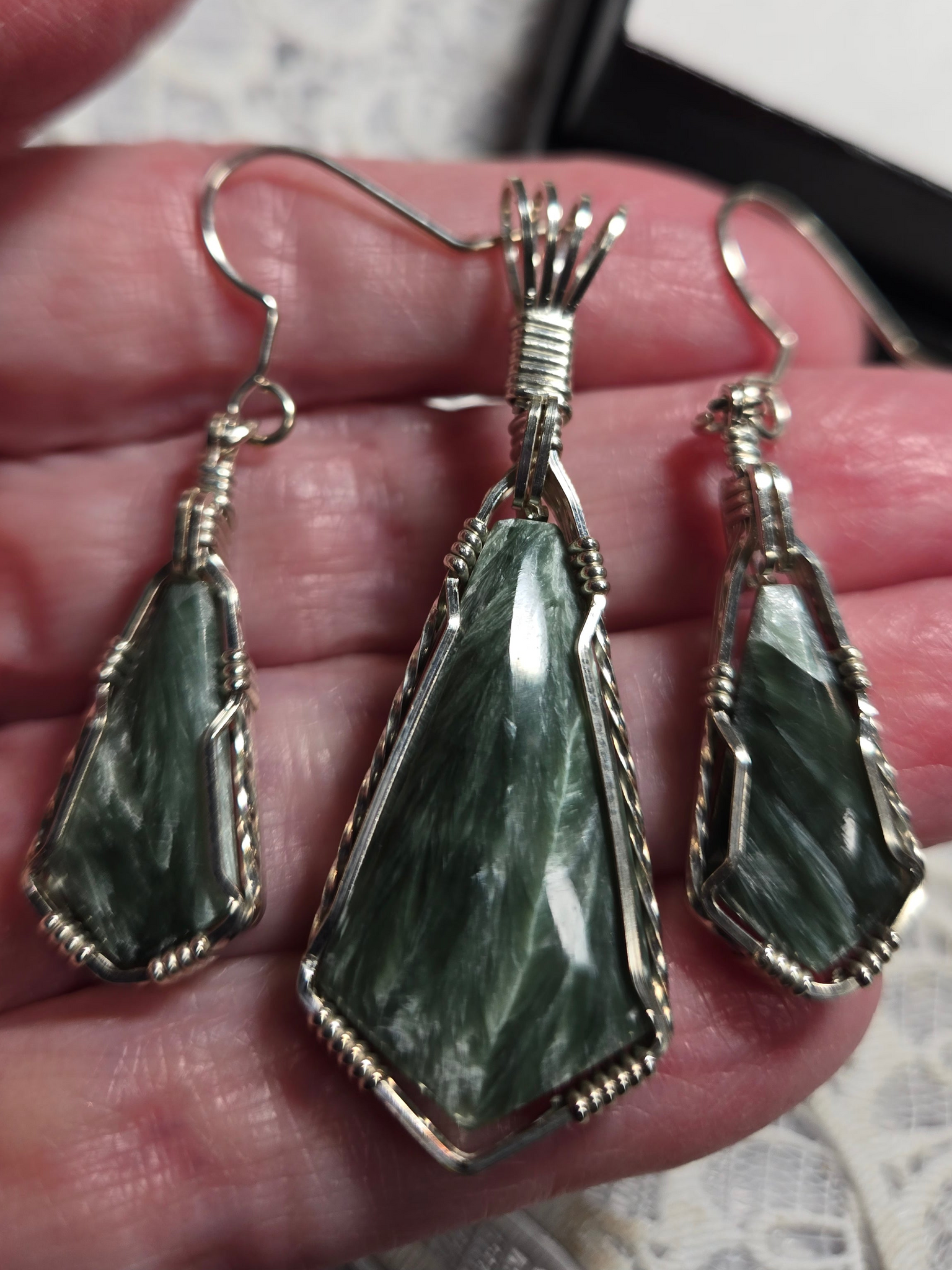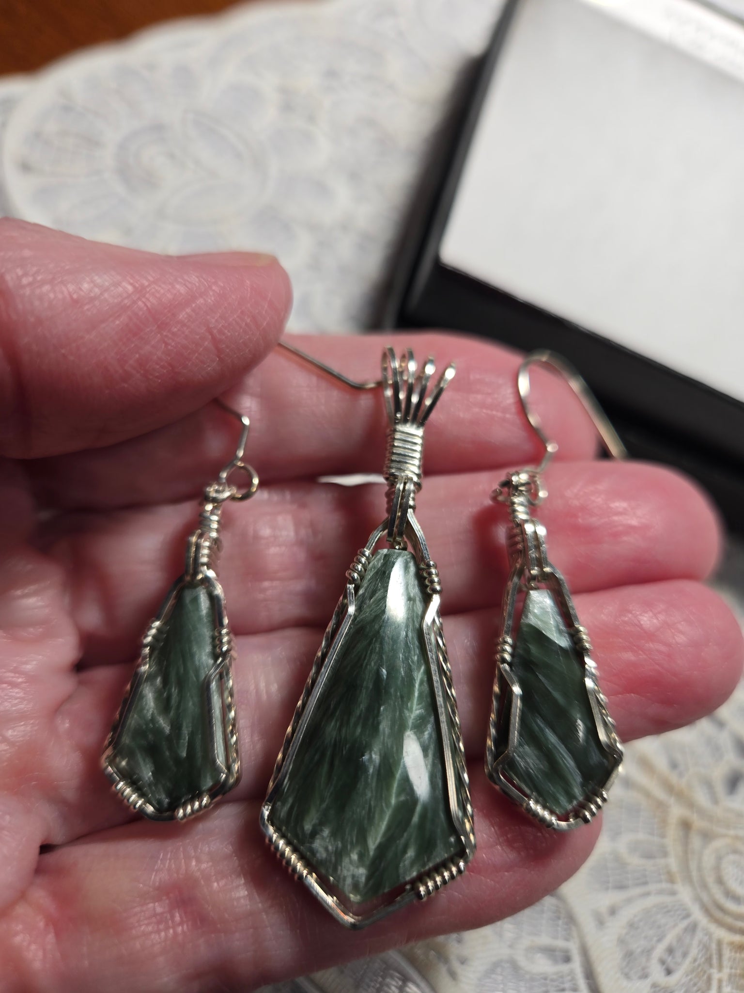 Custom Cut Polished & Wire Wrapped Seraphenite (Angel Stone) Set Necklace/Pendant & Earrings in Sterling Silver .935